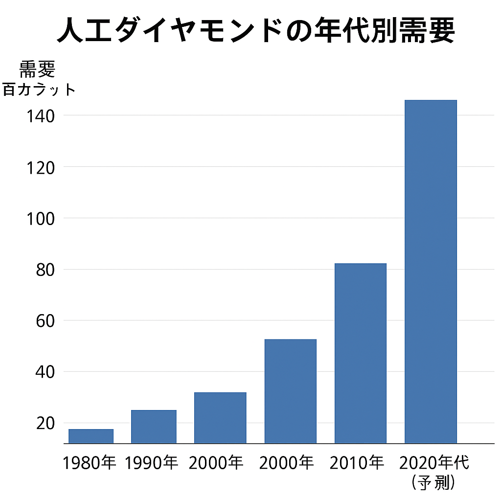 1980年代〜2000年代:需要は比較的低く、20百万カラット未満。主に切削・研磨などの工業用途が中心。
