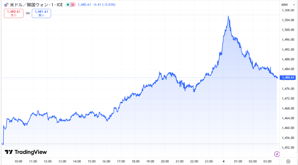 なんと深夜1時前に凄まじい勢いでウォンは急落してそのまま1490どころか、1500突破して1505ウォンまで落ちた。さすがにこちらも深夜なので起きていなかったんだが、急に3時頃に目が覚めてチャートを確認したら1500突破して大笑いだった。